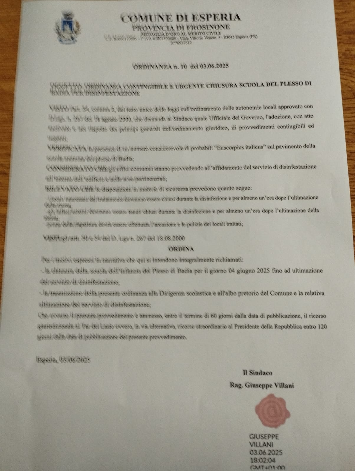 Circ. nr. 107 Chiusura plesso Scuola dell'Infanzia di Badia per disinfestazione